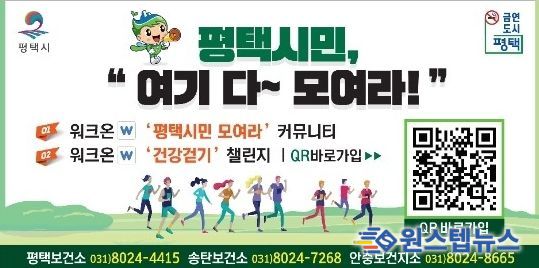 원스텝뉴스 이병희 기자 | 평택시는 시민들의 건강증진을 위해 스마트폰 하나로 누구나 쉽게 참여할 수 있는 모바일 건강 커뮤니티 ‘평택시민 모여라(워크온)’을 활발히 운영 중이라고 밝혔다.