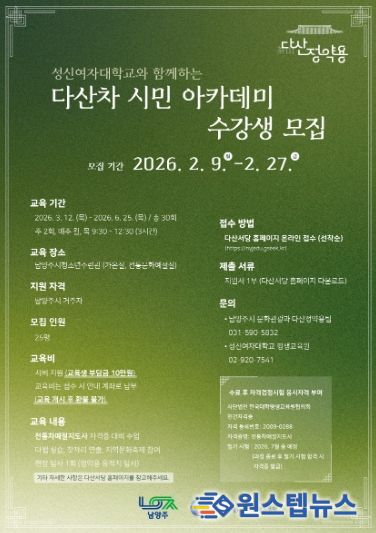 모집 인원은 총 25명으로, 남양주시 평생학습포털 ‘다산서당’을 통해 선착순으로 접수받는다. 교육비는 총 60만 원 상당이나 시의 교육 지원을 통해 10만 원의 자부담만으로 참여할 수 있다. 남양주시 거주 고등학교 졸업자 이상 시민이면 누구나 신청 가능하다.