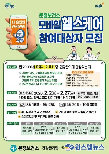 원스텝뉴스 이병희 기자 | 파주시 운정보건소는 시민의 자가 건강관리 능력 향상과 만성질환 예방을 위해 2026년 ‘모바일 헬스케어 사업’참여자를 모집한다.