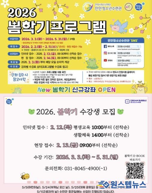 원스텝뉴스 이병희 기자 | 안양시청소년재단 소속 만안청소년수련관과 동안청소년수련관은 새 학기를 맞아 2026년 봄학기 정규 강좌 수강생 모집에 나선다.
