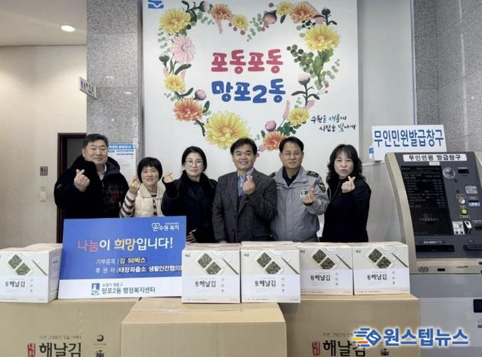 원스텝뉴스 이병희 기자 | 영통구 망포2동 행정복지센터는 지난 2일, 태장파출소 생활안전협의회가 설 명절을 맞아 저소득 가정을 지원하기 위해 김 50박스를 망포2동 행정복지센터(동장 이용태)에 기탁했다고 밝혔다.