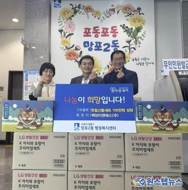 원스텝뉴스 이병희 기자 | 영통구 망포2동 행정복지센터는 지난 3일 백양티앤에스(주)가 설 명절을 맞아 100만 원 상당의 명절 선물세트를 망포2동 취약계층을 위해 기탁했다고 밝혔다.