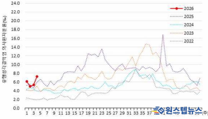 질병관리청 표본감시 자료에 따르면, 1월 넷째 주 유행성결막염 의사환자 분율은 인구 1,000명당 7.2명으로 집계됐다. 이는 전주(5.3명)보다 증가한 수치로, 2022년부터 2025년까지 최근 4년간 같은 기간과 비교해도 가장 높은 수준이다.