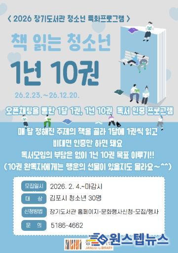 원스텝뉴스 천규영 기자 | 김포시 장기도서관은 청소년의 자발적인 독서 습관 형성을 위해 청소년 특화프로그램 ‘책 읽는 청소년 1년 10권’을 오는 2월 23일부터 연말까지 운영한다.