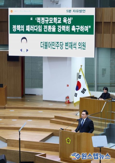 원스텝뉴스 이병희 기자 | 경기도의회 교육행정위원회 소속 변재석 의원(더불어민주당, 고양1)은 4일 열린 경기도의회 본회의 5분 자유발언을 통해 경기도교육청의 ‘적정규모학교 육성’ 정책이 통폐합과 폐교 중심으로 작동하고 있다며, 정책의 패러다임을 ‘정리’가 아닌 ‘지원’ 중심으로 전환할 것을 강력히 촉구했다.