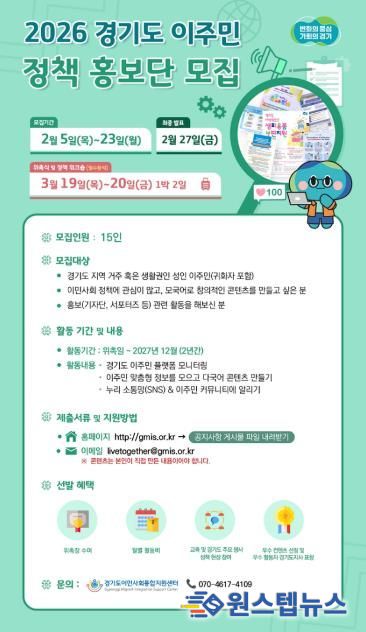 원스텝뉴스 이병희 기자 | 경기도이민사회통합지원센터에서 오는 23일까지 ‘2026 경기도 이주민 정책 홍보단’ 15명을 모집한다.