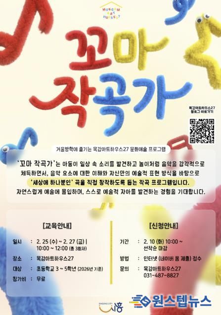 관내 거주하는 초등학생 3학년~5학년이라면 누구나 무료로 참여할 수 있다. 참여 신청은 2월 10일 10시부터 목감아트하우스27 또는 시흥문화예술 소통누리망(블로그ㆍ인스타그램)을 통해 가능하며 선착순으로 마감된다.
