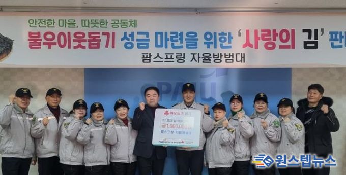 팜스프링 자율방범대는 지난 1월 30일 금촌3동 행정복지센터를 방문해 현금 100만 원을 전달했다. 이번 기탁금은 자율방범대원들이 직접 발로 뛰며 진행한 ‘사랑의 김 판매’수익금으로 마련되어 그 의미를 더했다.