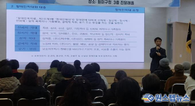 원스텝뉴스 이병희 기자 | 부천시는 지난 3일 부천시장애인인권센터와 함께 원미구청 진달래홀에서 ㈜햇빛나눔 소속 활동지원사 200여 명을 대상으로 ‘장애인활동지원사와 장애인 인권’을 주제로 교육을 실시했다.