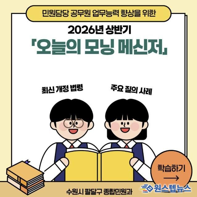 원스텝뉴스 이병희 기자 | 수원시 팔달구는 민원 담당 공무원을 대상으로 비대면 직무 역량 강화 교육인 ‘오늘의 모닝 메신저’를 운영한다고 밝혔다.