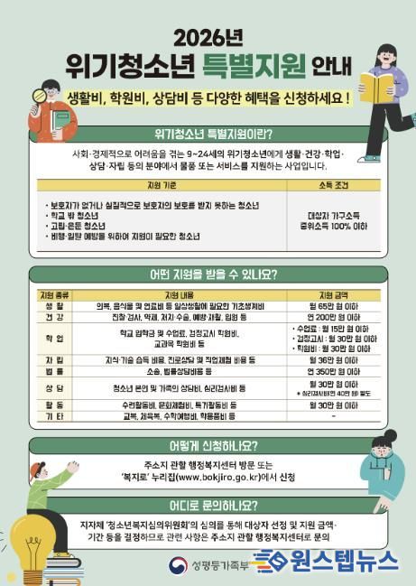 원스텝뉴스 이병희 기자 | 가평군이 사회·경제적 어려움에 놓인 위기청소년을 대상으로 특별지원 신청을 이달 27일까지 받는다. 보호 기반이 취약한 청소년의 기본 생활을 지키고 학업 중단을 막기 위한 조치다.
