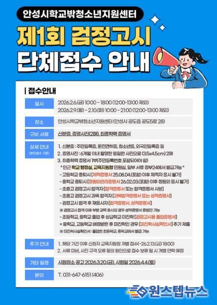 원스텝뉴스 이병희 기자 | 안성시학교밖청소년지원센터는 오는 4월 4일 시행되는 2026년도 제1회 검정고시와 관련하여 단체원서접수를 진행한다고 밝혔다.