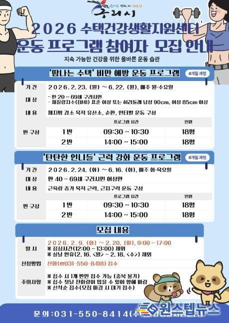 프로그램은 수택건강생활지원센터 운동프로그램실에서 진행되며, 전문 운동 지도 인력의 지도로 안전하고 효과적인 운동이 이뤄질 예정이다.
