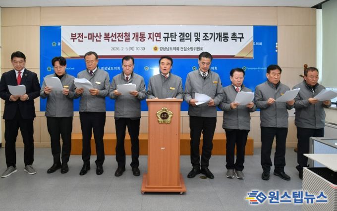 원스텝뉴스 이병희 기자 | 경상남도의회 건설소방위원회는 5일 기자회견을 열고, 6년째 표류 중인 ‘부전~마산 복선전철’ 사업의 조속한 개통을 촉구하며 정부의 무책임한 행정을 강력히 규탄했다.