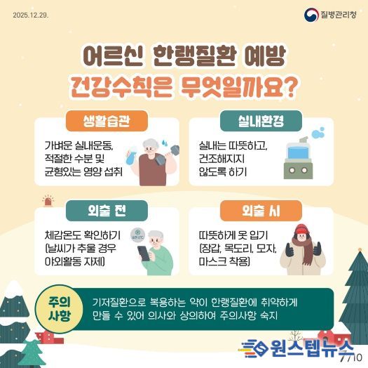 아울러 보건소에서는 경로당 등에 방문해 한랭질환 예방 교육과 홀몸 어르신 등 건강 취약계층의 정기적인 안부 확인, 그리고 관내 병원급 의료기관 6개소의 한랭질환 응급실 감시체계 운영 등을 통해 한랭질환 예방에 적극적으로 노력하고 있다고 전했다.