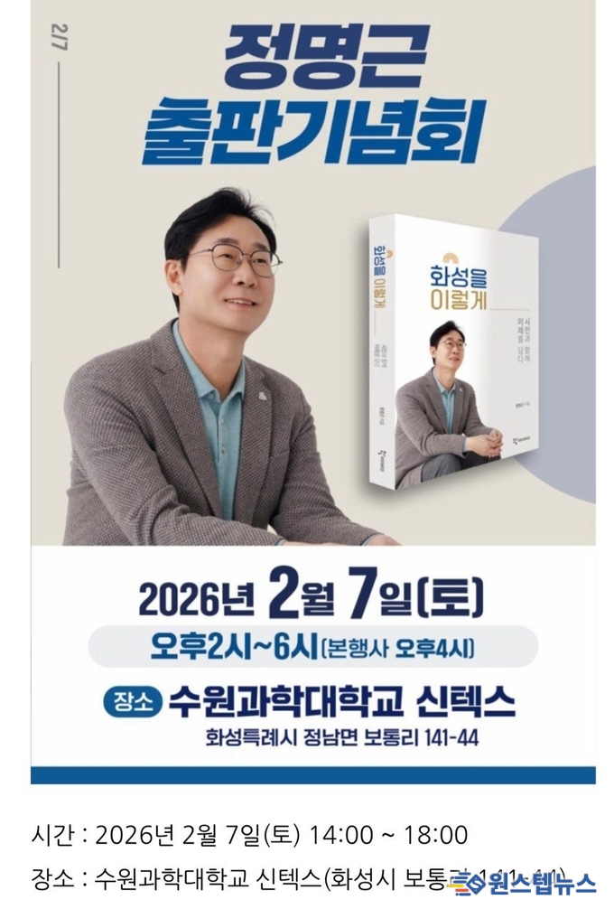 정명근 화성시장이 오는 2월 7일 오후 2시, 수원과학대학교 신텍스(SINTEX)에서 화성특례시의 발자취와 성과, 그리고 미래 비전을 담은 저서 『화성을 이렇게』의 출판기념회를 개최한다.