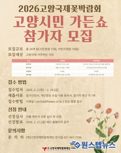 원스텝뉴스 천규영 기자 | (재)고양국제박람회재단이 오는 4월 24일 일산호수공원에서 개최되는 2026고양국제꽃박람회의 시민 참여 프로그램 ‘고양시민 가든쇼’의 참가자를 이달 20일까지 모집한다.