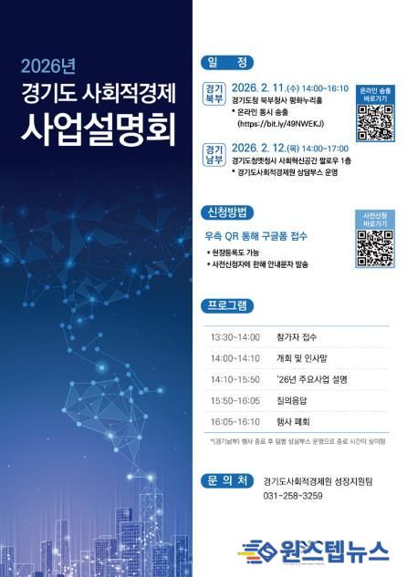 원스텝뉴스 이병희 기자 | 경기도사회적경제원은 오는 11일과 12일 양일간 경기 북부와 남부에서 ‘2026년 경기도 사회적경제 사업설명회’를 연다.