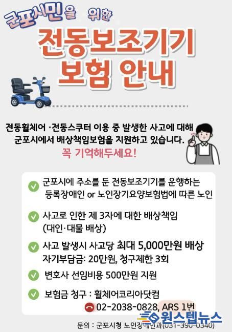 원스텝뉴스 이병희 기자 | 군포시는 전동휠체어와 전동스쿠터 등 전동보조기기를 사용하는 장애인 및 노인장기요양보험법에 따른 노인을 대상으로 배상책임보험을 지원한다.