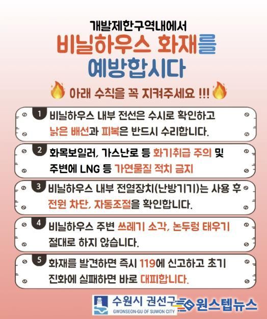 권선구 관계자는 “비닐하우스 화재는 작은 부주의로도 큰 피해로 이어질 수 있는 만큼, 기본적인 안전수칙 실천이 무엇보다 중요하다”며 “앞으로도 개발제한구역 내 화재 취약 시설을 대상으로 지속적인 점검과 홍보 활동을 이어가겠다”라고 밝혔다.