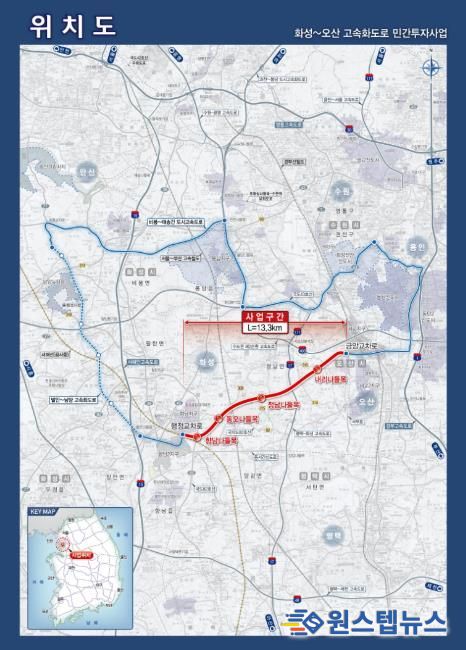 이 사업은 화성시 향남읍에서 오산시 금암동까지 약 13.3km 구간을 연결하는 왕복 4차로 자동차전용도로를 건설하는 것으로, 개통 시 수도권 서남부 지역의 교통 혼잡 해소와 이동 시간 단축, 산업·주거지역 접근성 개선에 크게 기여할 것으로 기대된다.