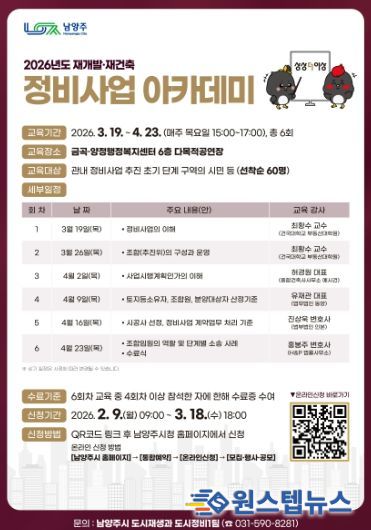원스텝뉴스 이병희 기자 | 남양주시는 오는 3월 19일부터 정비사업에 관심 있는 시민을 대상으로 ‘2026 상상더이상 정비사업 아카데미’를 열고, 이에 앞서 2월 9일부터 참가 신청 접수를 진행한다고 6일 밝혔다.