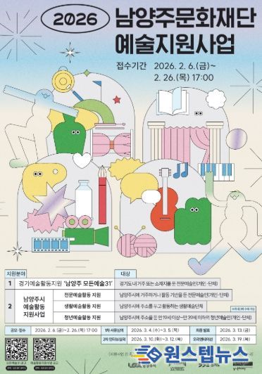 원스텝뉴스 천규영 기자 | 남양주시는 6일 남양주문화재단이 지역 예술인의 안정적인 창작 환경 조성과 시민 문화향유 기회 확대를 위해 ‘2026년 예술활동 지원사업 공모’를 추진하고, 오는 26일까지 접수를 진행한다고 밝혔다.
