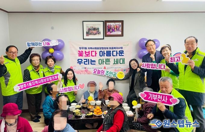 원스텝뉴스 이병희 기자 | 양주시 양주1동은 지역사회보장협의체가 최근 정서적 고립감을 느끼는 산북4통 90세 이상 어르신들을 대상으로 경로당에서 '꽃보다 아름다운 우리는 아흔 세대' 사업을 추진했다고 밝혔다.