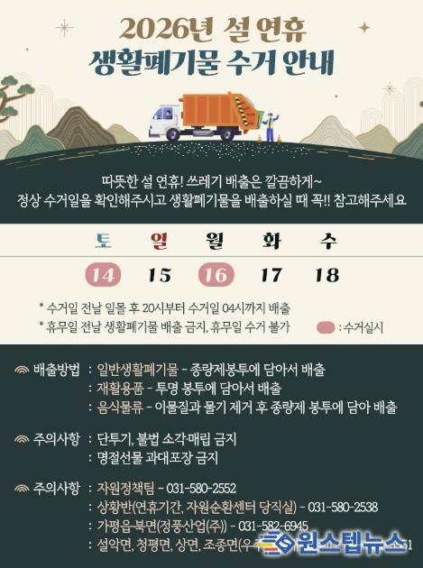 원스텝뉴스 이병희 기자 | 가평군은 설 명절을 맞아 군민과 방문객 모두가 쾌적한 환경에서 청결한 연휴를 보낼 수 있도록 생활폐기물 처리 대책을 마련했다.