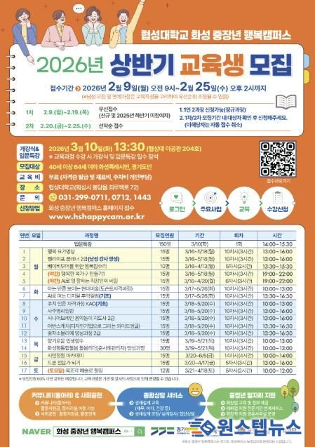 원스텝뉴스 이병희 기자 | 화성특례시와 경기도는 오는 2월 9일부터 2월 25일까지 중장년 세대의 인생 재도약을 위한 ‘화성 중장년 행복캠퍼스’ 상반기 교육생을 모집한다.