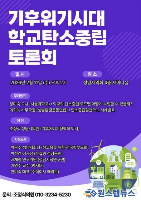 원스텝뉴스 이병희 기자 | 기후위기 대응과 학교 현장의 탄소중립 실천 방안을 논의하기 위한 '기후위기 시대 학교 탄소중립 토론회'가 오는 2026년 2월 11일 오후 2시, 성남시의회 4층 세미나실에서 열린다.