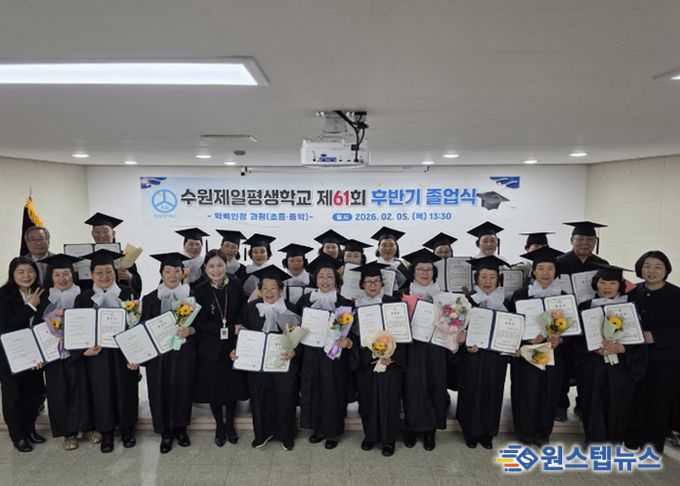 원스텝뉴스 이병희 기자 | 수원제일평생학교는 2월 5일 오후 제61회 하반기 학력인정 졸업식을 진행했다. 졸업식은 교내 난타 동아리의 축하 공연으로 시작됐으며, 경기도교육청·수원교육지원청·수원시청 관계자들이 참석해 자리를 함께했다.
