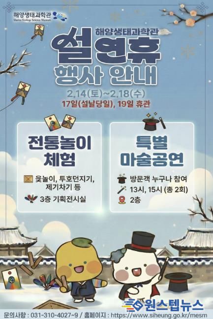 원스텝뉴스 이병희 기자 | 시흥시는 설 명절을 맞아 시민과 방문객이 뜻깊은 시간을 보낼 수 있도록 오는 2월 14일부터 18일까지 해양생태과학관에서 설 연휴 특별 행사를 운영한다.