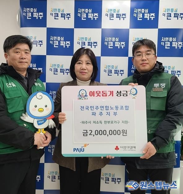 전달식에는 김은숙 복지정책국장을 비롯해 전국민주연합노동조합 파주지부 장수명 지부장, 정종민 대의원이 참석했다. 이날 전달된 성금 200만 원은 관내 저소득 한부모가구 4가구에 50만 원씩 지원될 예정이다.