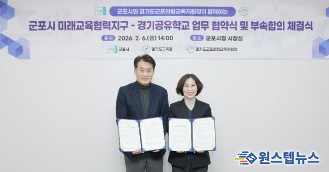 원스텝뉴스 이병희 기자 | 군포시는 지난 6일 경기도교육청과 ‘군포시 미래교육협력지구–경기공유학교’ 업무협약을 체결하고, 군포의왕교육지원청과 2026년 경기공유학교 학교맞춤형(군포시 미래교육협력지구) 세부사업 추진을 위한 부속합의를 체결했다.