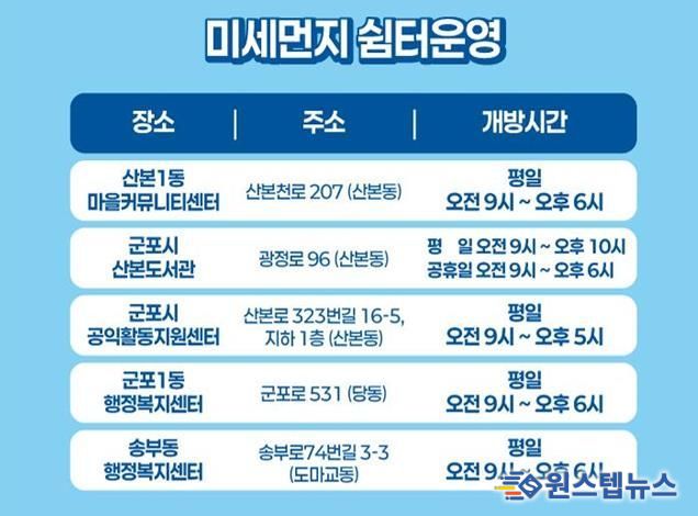 현재 운영 중인 미세먼지 쉼터는 ▲산본1동 마을커뮤니티센터 ▲산본도서관 ▲군포시 공익활동지원센터 ▲군포1동 행정복지센터 ▲송부동 행정복지센터 등 총 5개소이며, 이용 시간은 평일 오전 9시부터 오후 6시까지다. 다만, 시설별 세부 운영 시간은 각 쉼터에 문의하면 된다.