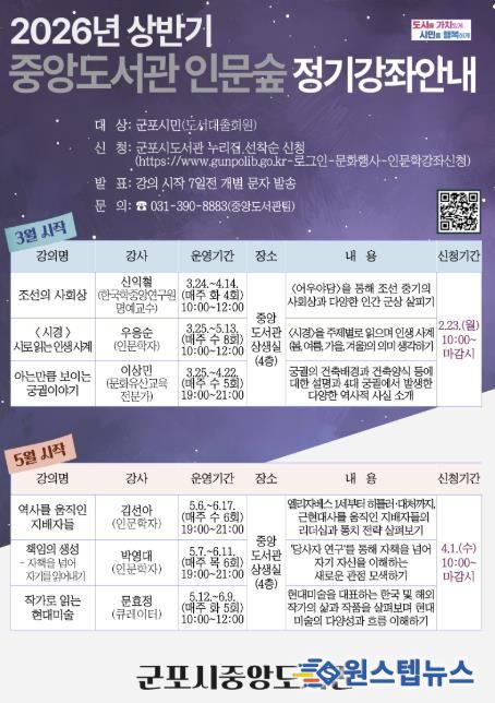 원스텝뉴스 이병희 기자 | 군포시중앙도서관은 시민의 인문학적 소양을 함양하고 공동체적 성찰의 기회를 확대하고자 ‘중앙도서관 인문숲’ 상반기 강좌를 운영한다.