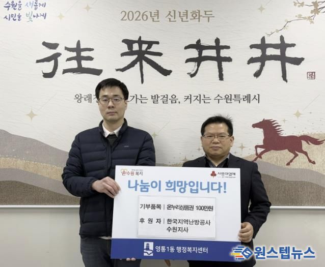 원스텝뉴스 이병희 기자 | 영통구 영통1동은 지난 9일 한국지역난방공사 수원지사가 설 명절을 맞아 영통1·2·3동 행정복지센터에 각각 온누리상품권 100만 원씩을 기탁했다고 밝혔다.
