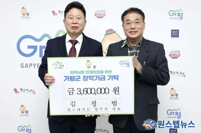 원스텝뉴스 이병희 기자 | 김정범 가평읍 힐스테이드 입주자 대표가 9일 가평군을 방문해 장학기금 360만 원을 기탁했다. 이번 장학금 기탁은 지역 학생들의 꿈과 미래를 응원하기 위해 마련됐다.