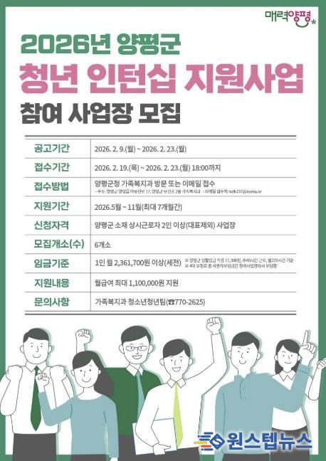 원스텝뉴스 이병희 기자 | 양평군은 인력이 필요한 관내 사업장과 관내 거주 미취업 청년을 연계하고 사업장에 인건비를 지원하는 ‘청년 인턴십 지원 사업’ 참여 사업장을 오는 2월 19일부터 23일까지 모집한다.