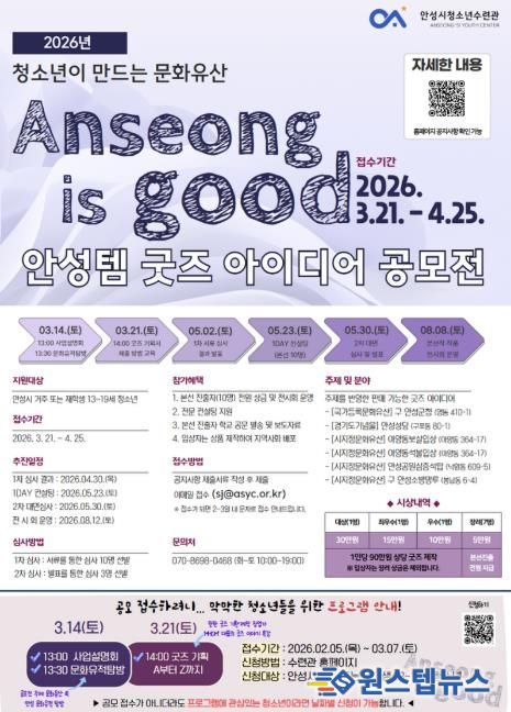 원스텝뉴스 이병희 기자 | 안성시청소년수련관은 청소년이 지역 문화유산을 창의적인 굿즈로 재해석하는 '2026 청소년이 만드는 문화유산 ‘안성템 굿즈 아이디어 공모전’'을 개최하고, 오는 3월부터 참가 청소년을 모집한다고 밝혔다.