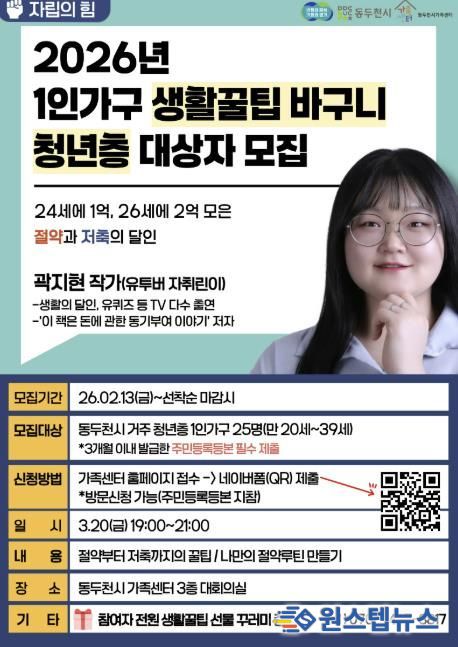 이번 프로그램은 연령별 맞춤 생활꿀팁 강의와 생활꿀팁 꾸러미를 제공하고, 2026년 동두천시 1인 가구 지원사업을 소개하는 시간도 함께 마련해 다양한 맞춤형 프로그램 연계를 지원할 예정이다.