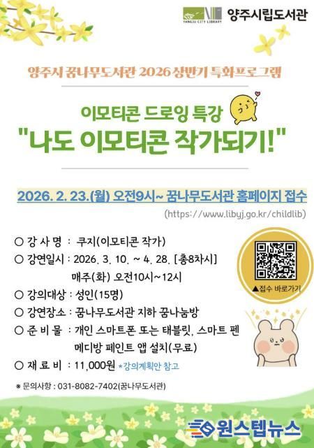 원스텝뉴스 이병희 기자 | 양주시 꿈나무도서관이 2026년 특화주제 프로그램으로 성인 대상의 ‘이모티콘 드로잉 특강’을 3월 10일부터 8주간 운영한다.