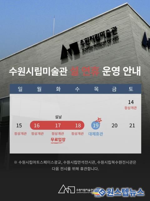 수원시립미술관 행궁 본관은 설 연휴 기간인 2월 15일부터 18일까지 정상 개방하며 설 당일인 2월 17일에는 무료 관람을 실시하며, 2월 19일에 대체 휴관한다.