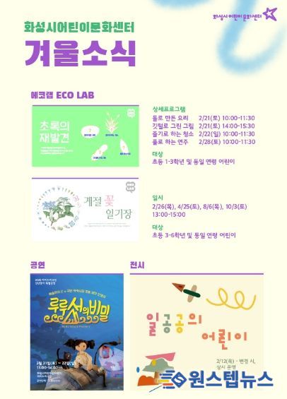 원스텝뉴스 천규영 기자 | 화성시어린이문화센터는 새해를 맞아 지역 생태환경을 주제로 한 특별 교육 프로그램‘에코랩(Eco Lab)’을 운영한다고 9일 밝혔다.