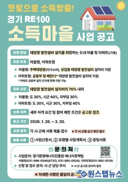 이 사업을 통해 태양광 발전설비를 설치할 경우 경기도와 고양시로부터 ‘마을형’은 설치비의 70%, ‘아파트형’은 60%까지 보조금을 지원받을 수 있다.