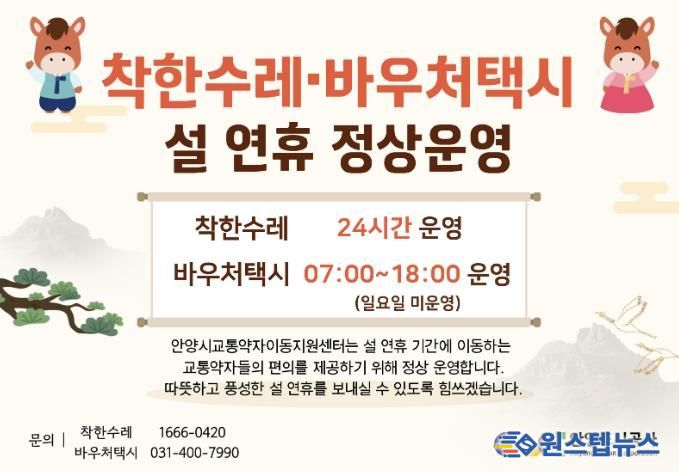 원스텝뉴스 이병희 기자 | 안양시는 2월 14일부터 18일까지 설 명절 연휴 기간에도 ‘착한수레’와 ‘바우처택시’를 정상 운영한다고 11일 밝혔다. 두 교통수단은 대중교통 이용이 어려운 장애인·임산부·영유아 등 교통약자의 병원 진료, 등·하교, 출·퇴근 등 일상 이동을 지원한다.
