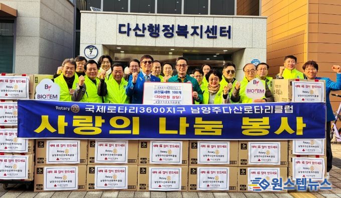 원스텝뉴스 이병희 기자 | 남양주시는 11일 국제로타리3600지구 남양주다산로타리클럽과 울림로타리위성클럽이 다가오는 설을 맞아 300만 원 상당의 설 선물세트를 다산1동 지역사회보장협의체에 기탁했다고 밝혔다.