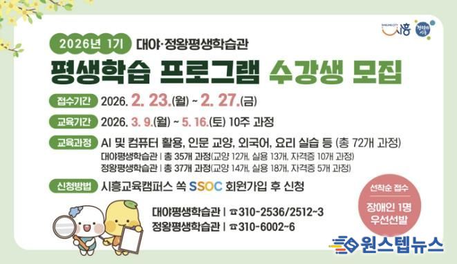 원스텝뉴스 이병희 기자 | 시흥시 대야ㆍ정왕평생학습관은 오는 2월 23일부터 27일까지 ‘2026년 1기 평생학습 프로그램’ 수강생을 모집한다. 이번 1기 프로그램은 3월 9일부터 5월 16일까지 10주간 운영된다.