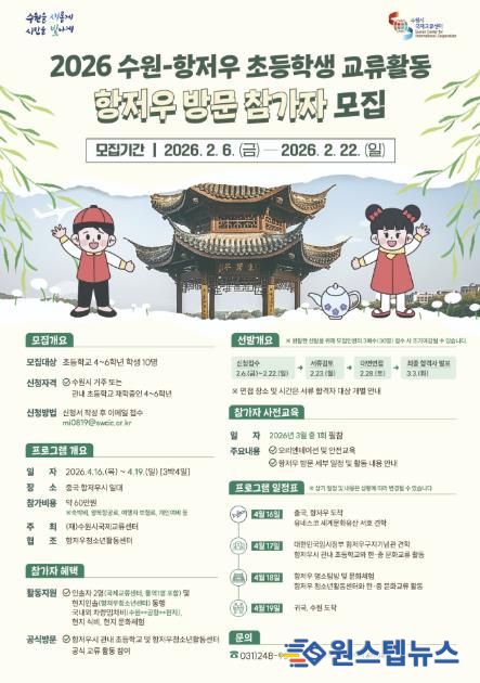 원스텝뉴스 이병희 기자 | 수원특례시는 ‘2026 수원–항저우 초등학생 상호방문교류’에 참여할 초등학생 10명을 2월 22일까지 모집한다.